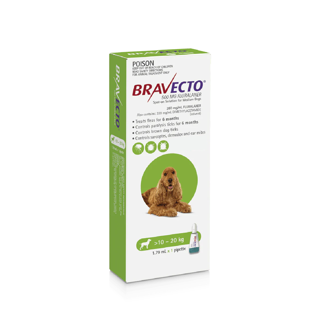 גלו טיפול עוצמתי נגד פרעושים וקרציות עם Bravecto תמיסה לטפטוף לכלבים. הפורמולה החזקה מסייעת לשמור על הכלב שלכם מוגן וללא גרד, הודות לרכיב הפעיל המרכזי: 280 מ"ג/מ"ל FLURALANER.