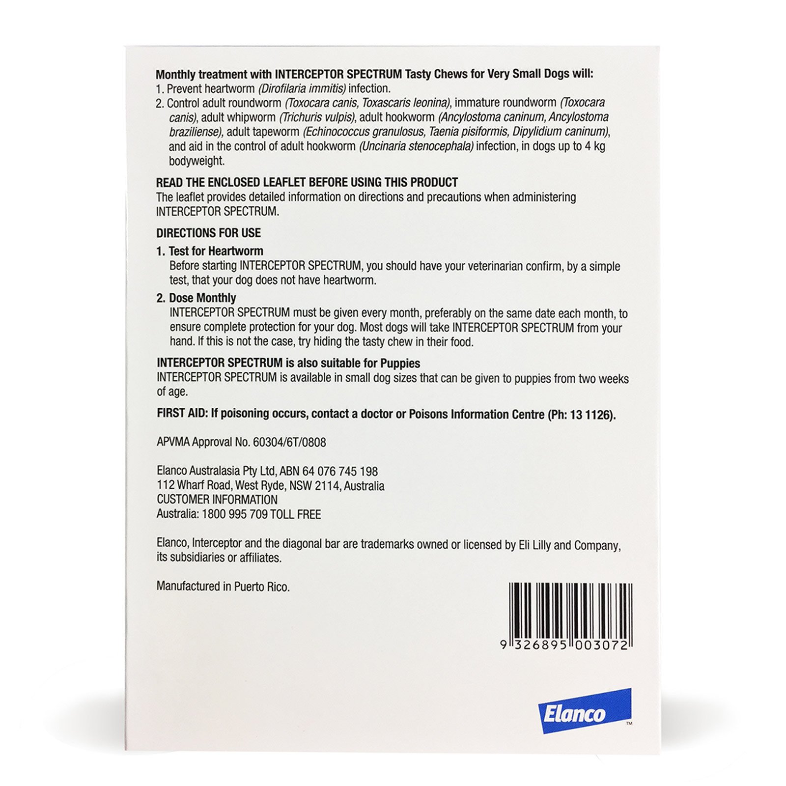 Interceptor Spectrum מספק הגנה חודשית מקיפה לכלבים ולגורים מפני כל סוגי התולעים העיקריים, כולל תולעת הפארק (Heartworm), תולעי מעיים ותולעי סרט.