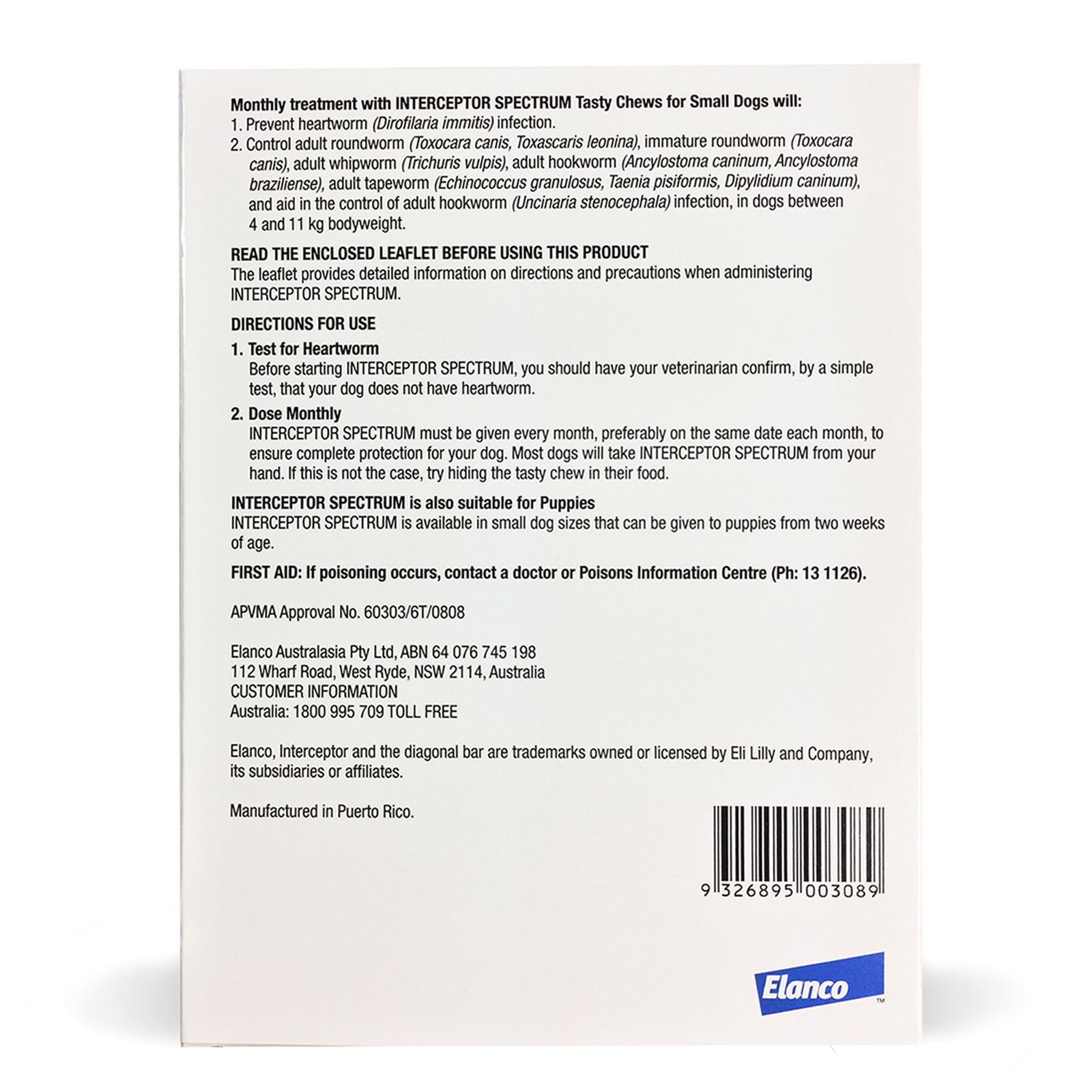 Interceptor Spectrum מספק הגנה חודשית מקיפה לכלבים ולגורים מפני כל סוגי התולעים העיקריים, כולל תולעת הפארק (Heartworm), תולעי מעיים ותולעי סרט.