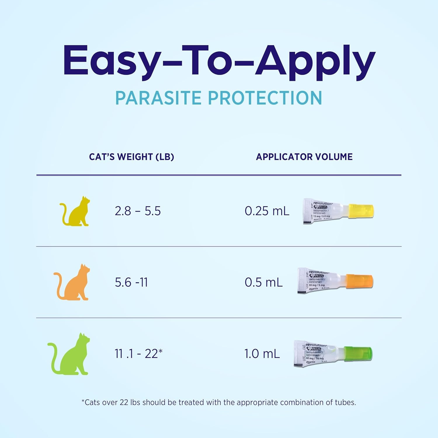Revolution PLUS מספק פתרון מקיף בטפטוף (Spot-On), עם הגנה רחבת טווח לחתולים ולגורי חתולים מפני טפילים חיצוניים ופנימיים. מיועד לשימוש בחתולים ובגורי חתולים מגיל 8 שבועות ומעלה, במשקל מינימלי של 1.25 ק"ג, ומתמודד בקלות עם מגוון בעיות.