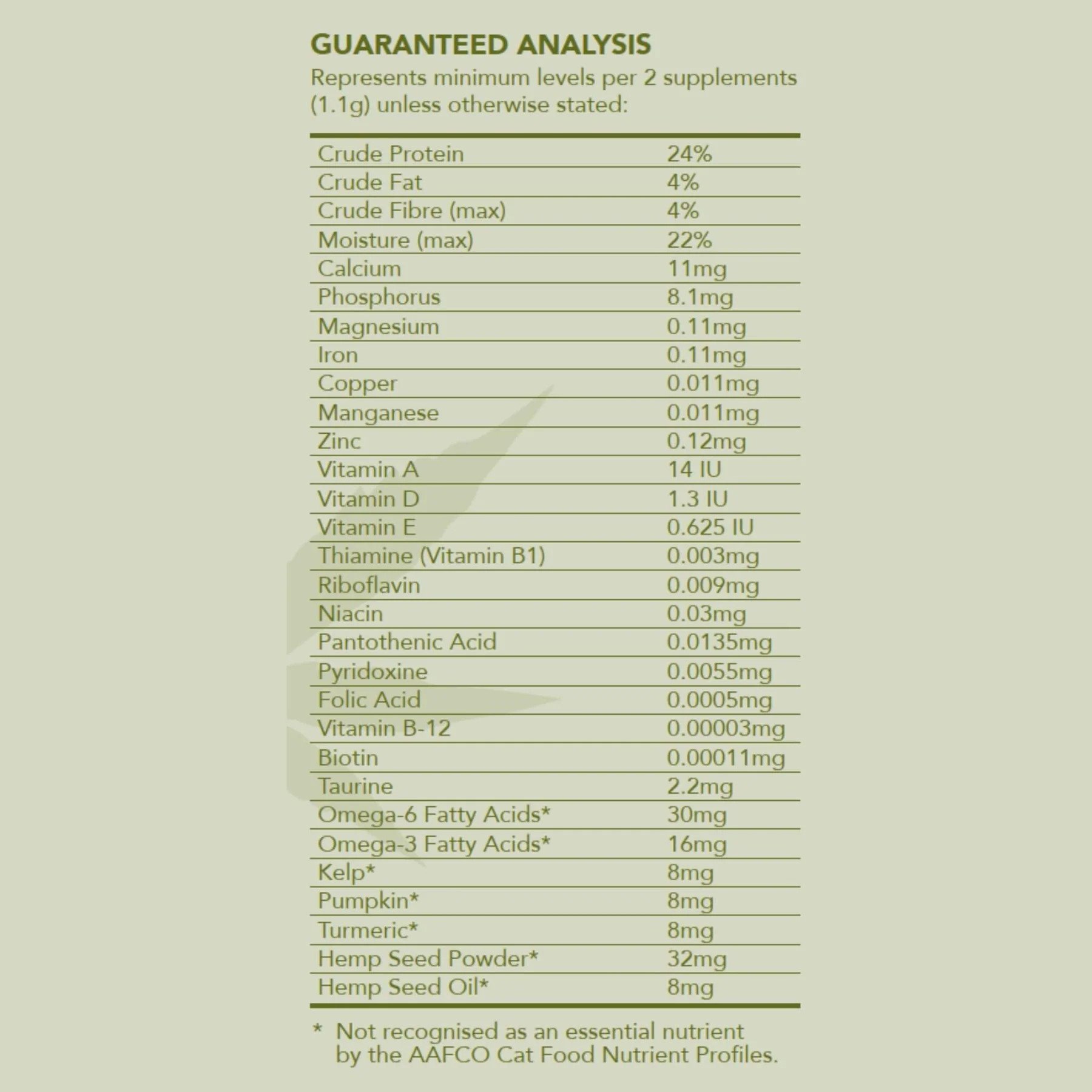 קמח דגים אוסטרלי, בטטות, חומוס, דקסטרוז, שומן עוף, חומר טעם טבעי, אבקת זרעי המפ, זרעי פשתן טחונים, מלח ים, שמן זרעי המפ, כורכום, אצת קלפ, דלעת, שמן קוקוס, קייל, אוכמניות, לציטין חמניות, אשלגן סורבט, ויטמינים (תוסף ויטמין E, ניאצין (ויטמין B3), סידן פנטותנט (ויטמין B5), ריבופלבין (ויטמין B2), פירידוקסין הידרוכלוריד (ויטמין B6), תיאמין מונוניטראט (ויטמין B1), חומצה פולית, ביוטין, תוסף ויטמין A, תוסף ויטמין B12, תוסף ויטמין D3), מינרלים (אבץ סולפט, ברזל סולפט, מגנזיום אוקסיד, נחושת סולפט, מנגן אוקסיד, יוד, נתרן סלניט), טאורין, טוקופרולים מעורבים (חומר משמר טבעי), תמצית רוזמרין.