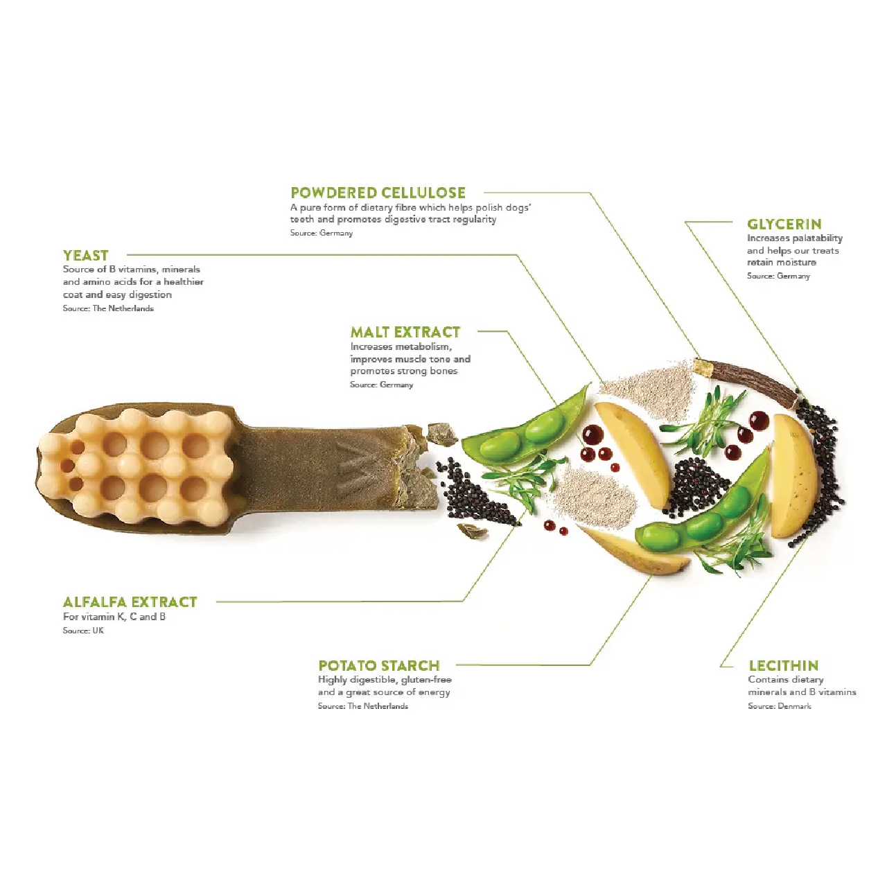 עמילן תפוחי אדמה, גליצרין, תאית אבקתית, לציטין, שמרים, תמצית מאלט, לופין.
